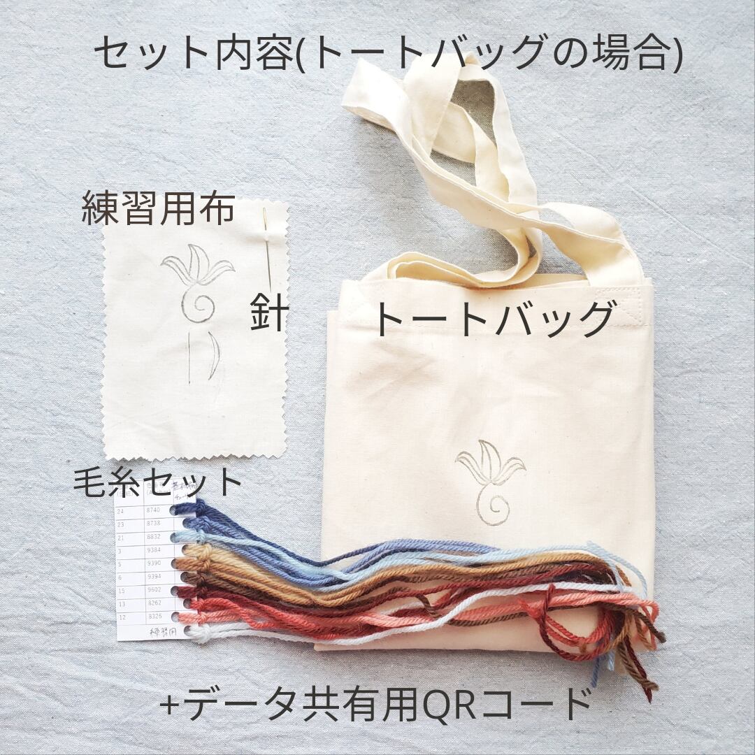 ブローチとトートバッグいずれかお好みのものをお選び下さい。※トートバッグは既にバッグの形になっています。それにより多少の差ですが縫いにくさを感じる方もいらっしゃいます。手を慣らす目的で練習用布も同封します。